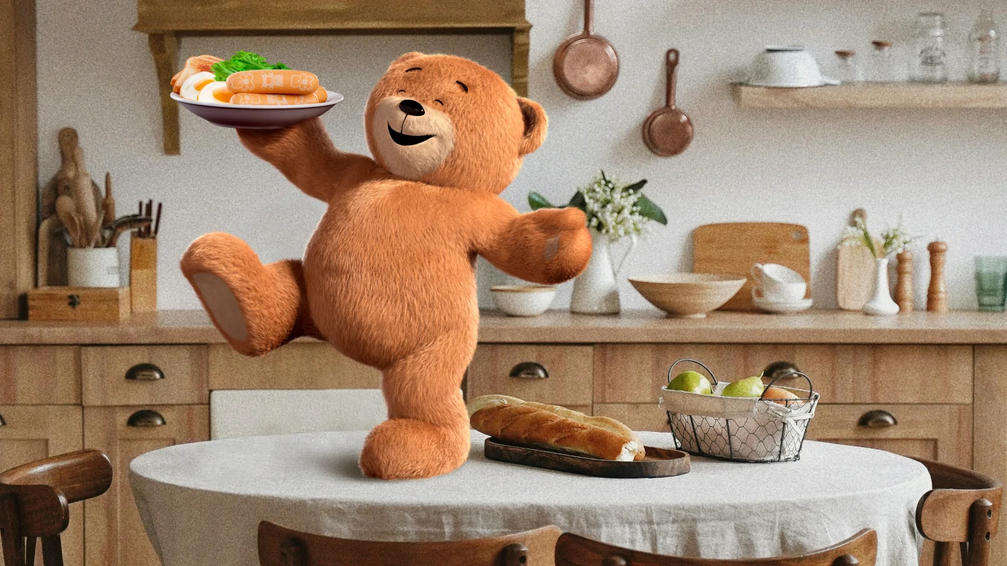 Кроме того, мы разработали 3D-модель объектов-реквизитов для одной из поз персонажа: блюдо и его содержимое, включая фотореалистичную сосиску с фирменным паттерном с медвежонком.