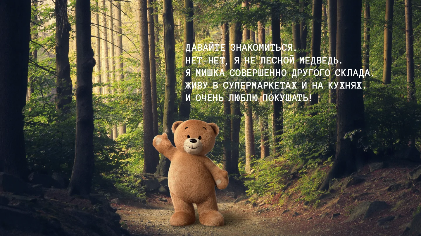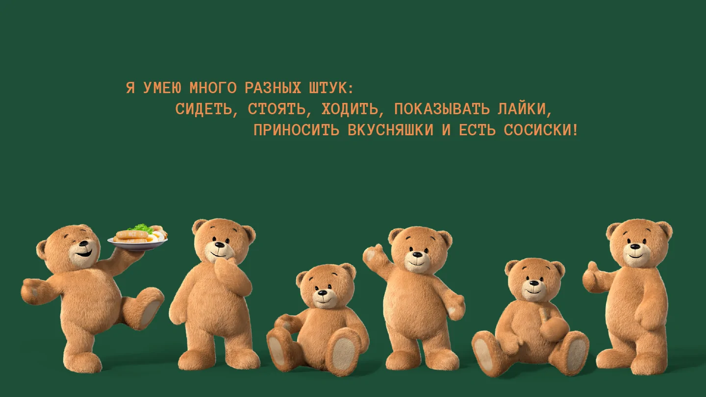 разработать 3D-персонажа «Мишутка» — современного, милого и узнаваемого медвежонка, образ которого уже полюбился потребителям. Он должен точно соответствовать изображению на упаковке и стать универсальным инструментом для digital- и офлайн-коммуникации бренда