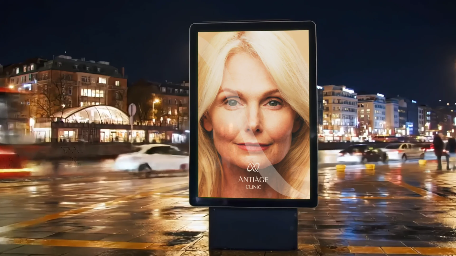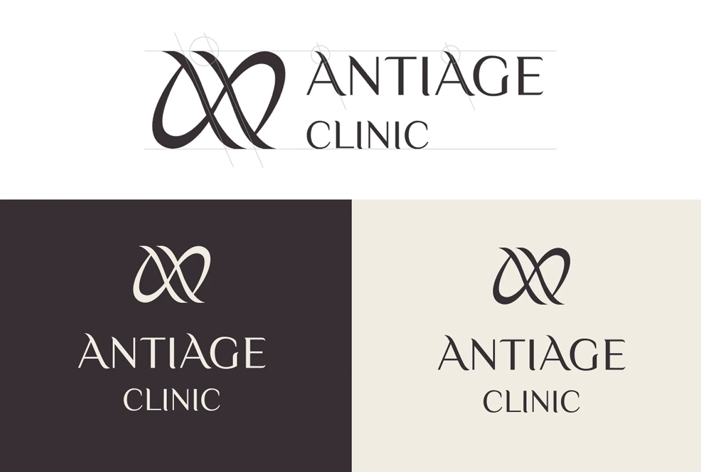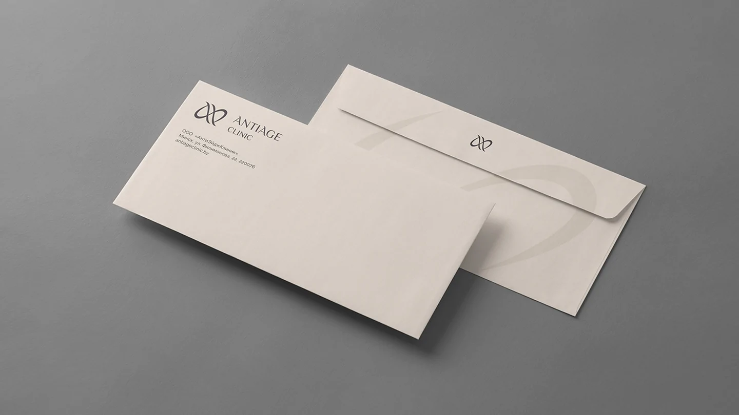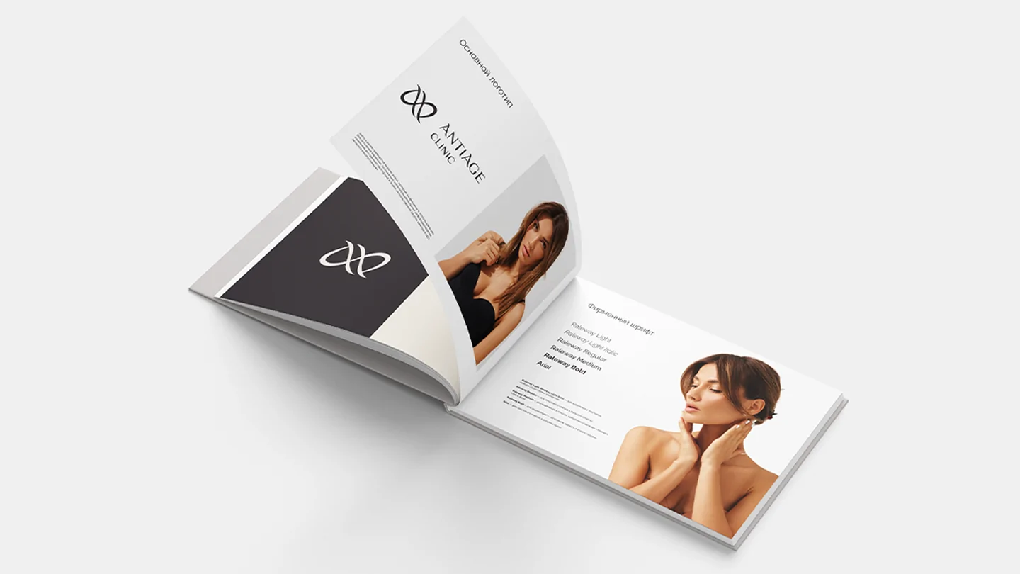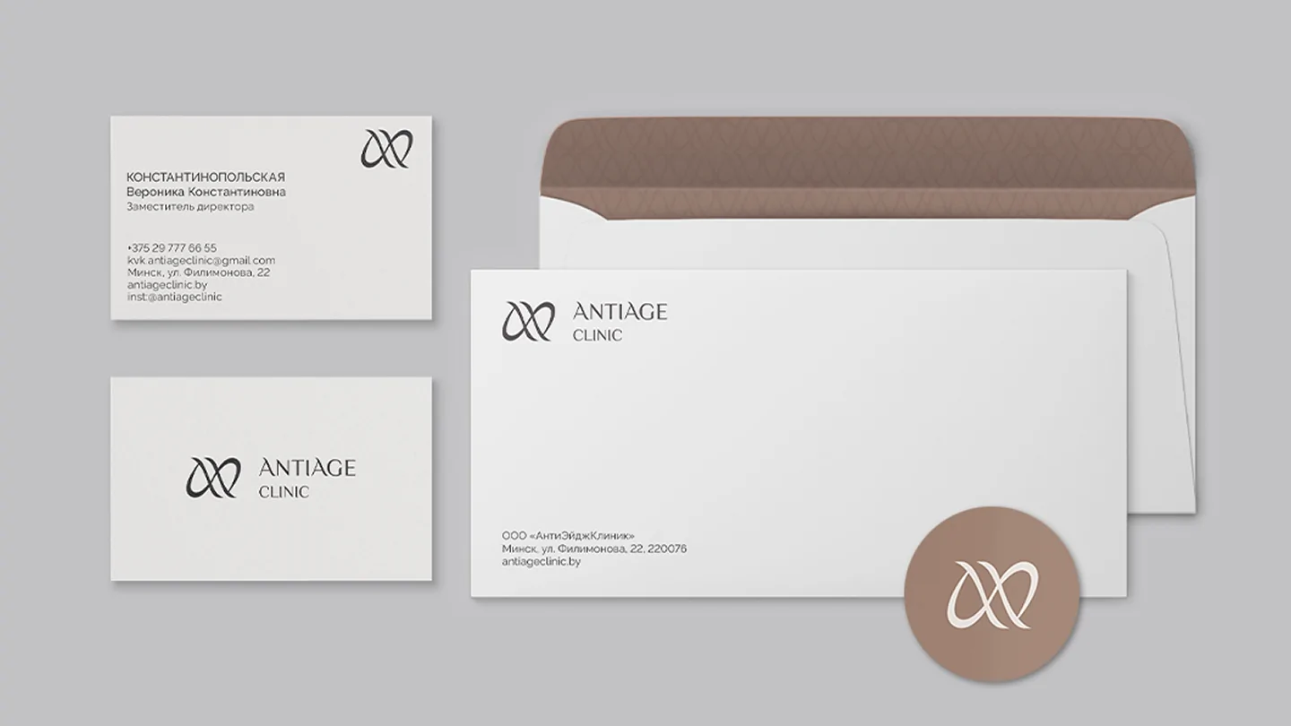 Визуальная концепция строится вокруг контрастной графической метафоры — стилизованной пары строчных букв «а», образующих ассоциативную игру слов «anti//age». Такая параллель служит не только стилистическим решением, но и глубоким символом: отражение борьбы времени с молодостью, а также вечного стремления человека к сохранению красоты. Кроме того, этот приём задаёт визуальный ритм и динамику — напоминая знак бесконечности, как символ вечной привлекательности и жизненной энергии. Графический знак органично вписан в логотип и вместе с ним создаёт цельную, лаконичную и запоминающуюся айдентику