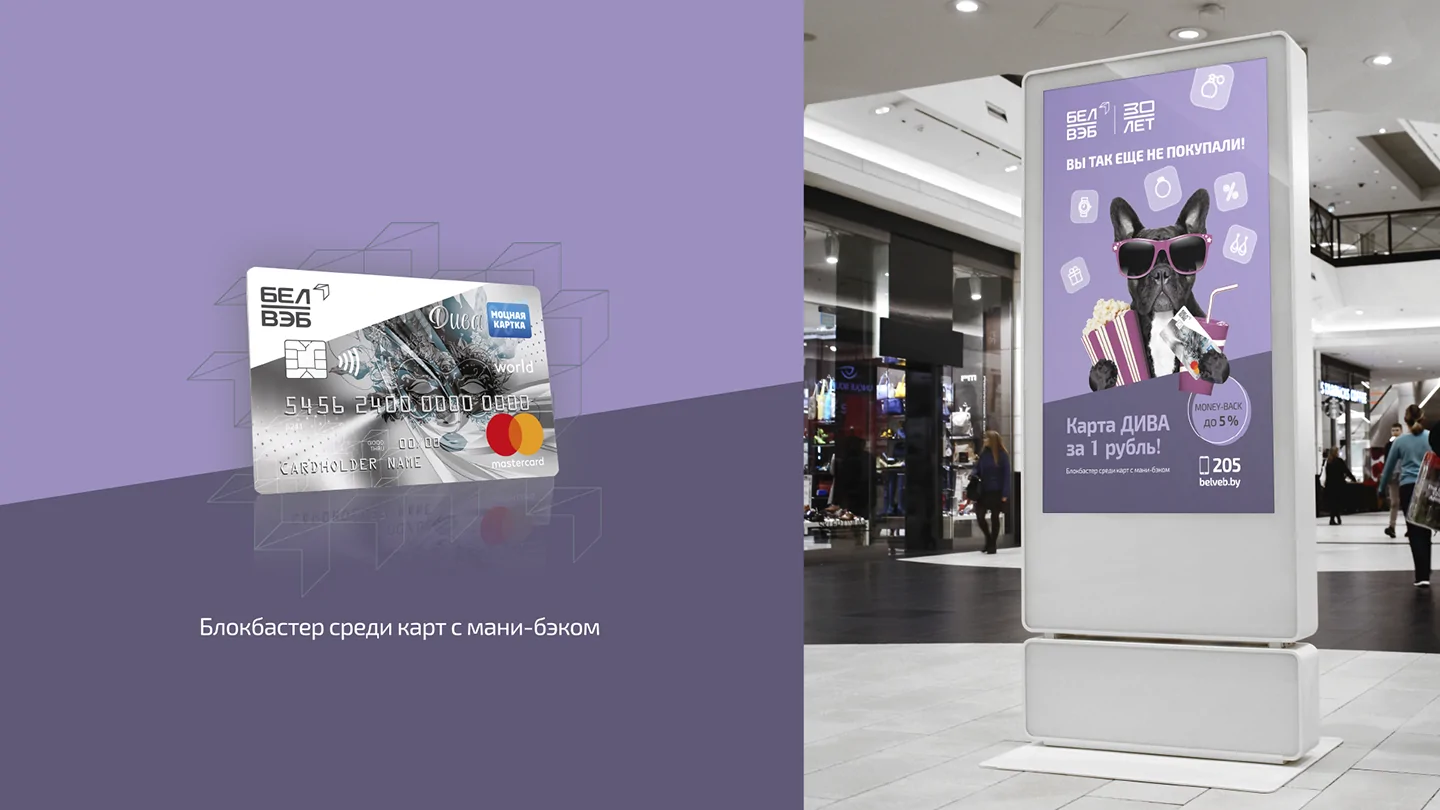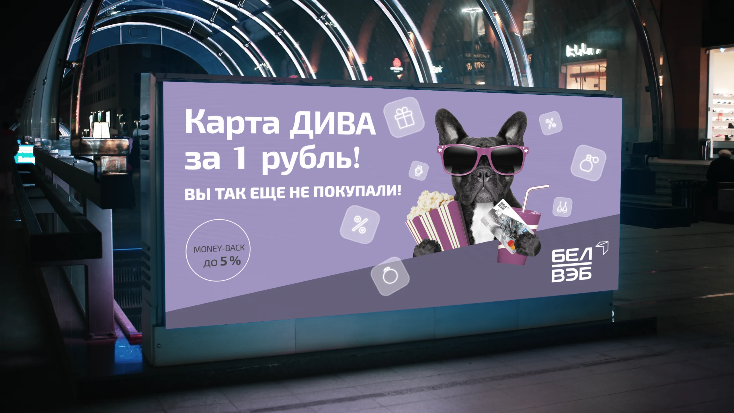 Для карты «Дива» БелВЭБ стояла задача создать яркий и запоминающийся key visual, который будет одинаково эффективно работать в разных каналах — от наружной рекламы до digital.