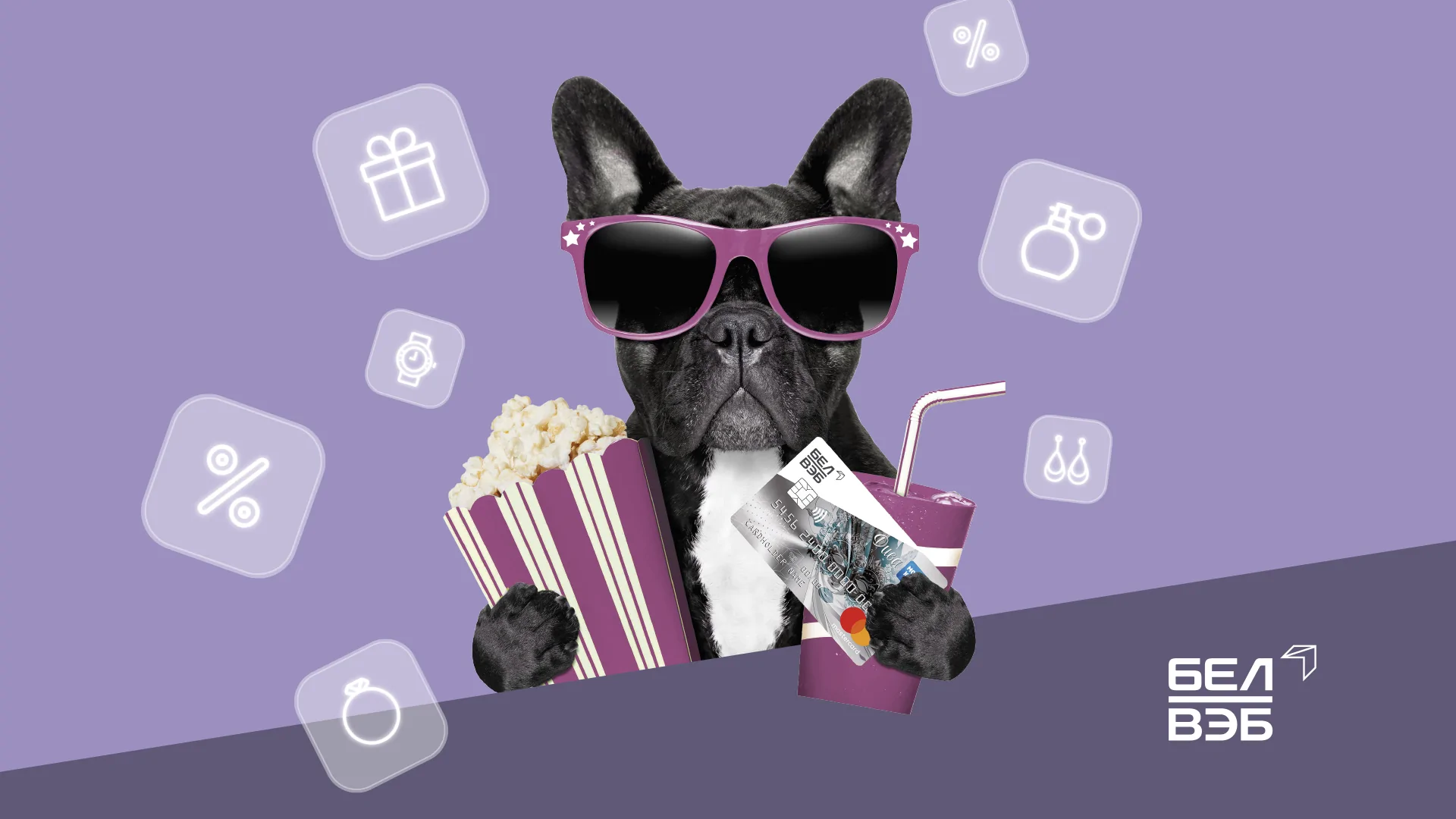 Главным героем стал милый мопс в атмосфере кинотеатра — с попкорном, напитком и картой в лапах.