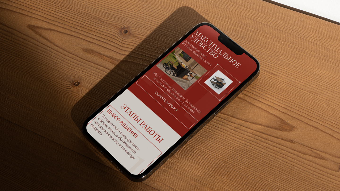 Визуальная концепция лендинга опиралась на бренд-платформу (ссылка на кейс по брендингу). Все элементы фирменного стиля были интегрированы в интерфейс: элегантная типографика подчёркивает премиальность, минималистичная сетка отражает скандинавскую строгость, а акценты в цвете и фактурах отсылают к итальянской эстетике.