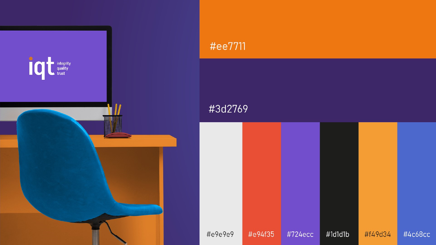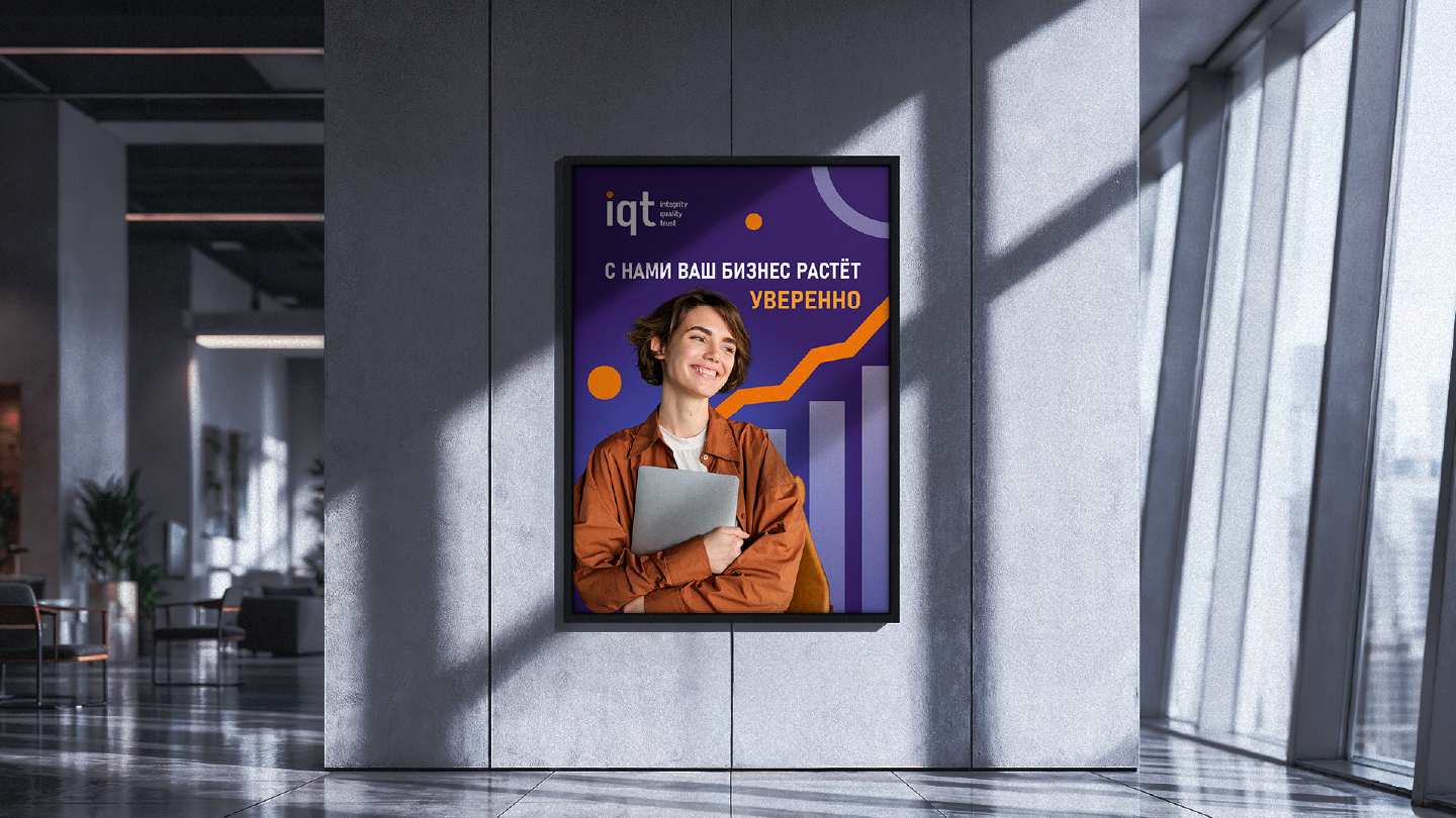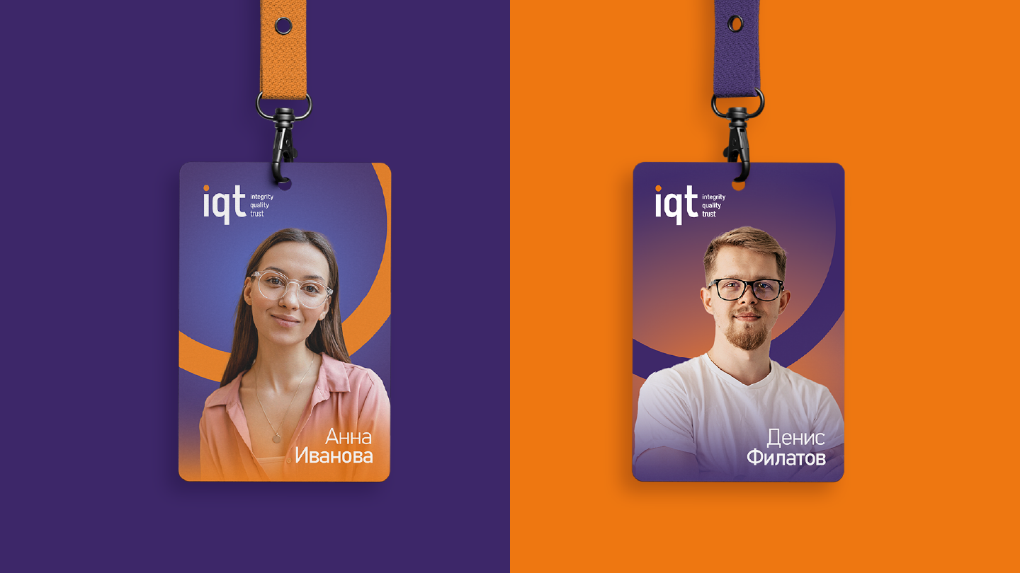 Основным цветом бренда стал фиолетовый. Его семантика объединяет мудрость, благородство и стратегическое мышление. В рамках одного визуального образа цвет отражает стремление компании быть лучшими и выстраивать долгосрочные отношения с клиентами. Фиолетовый также ассоциируется с внутренней сосредоточенностью и абстрагированием, что перекликается с ключевыми принципами работы IQT — глубоким погружением в задачи и широким взглядом на бизнес-контекст. Кроме того, цвет подчёркивает креативный подход и способность команды превосходить ожидания клиентов.