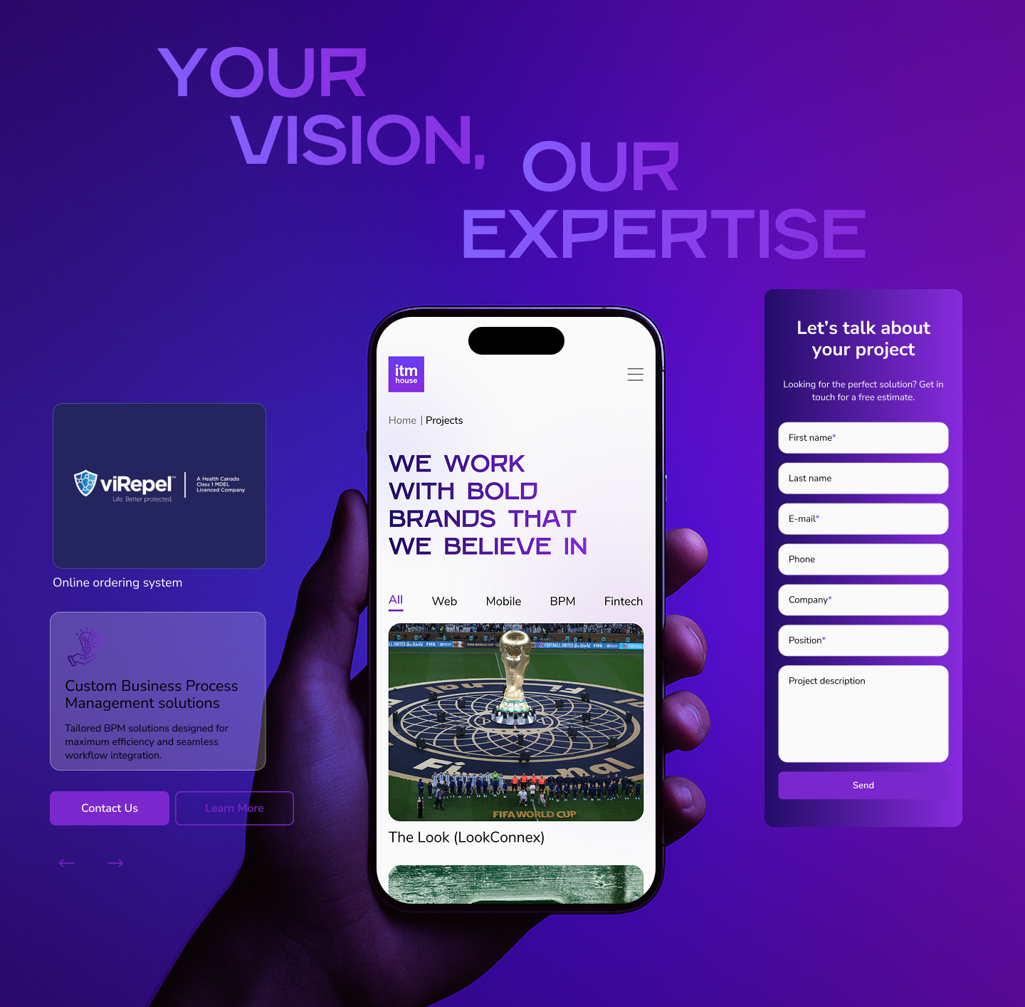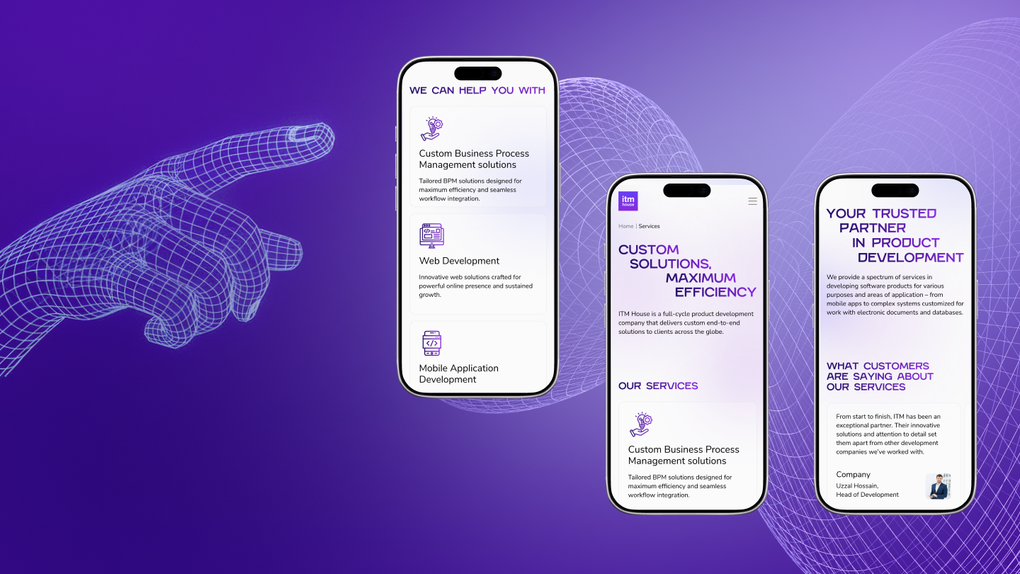 cпецифика проекта заключалась в необходимости совместить технологическую сложность услуг ITM House с их доступной и понятной подачей. Компания работает в высококонкурентной среде, где доверие формируется через демонстрацию реальной экспертизы, поэтому важно было показать глубину компетенций и при этом сохранить лёгкость восприятия. Контент включал сложные технологические направления, которые требовали структурированного представления, а визуальный стиль должен был объединить строгую цифровую эстетику с тёплым человеческим характером бренда. Дополнительно сайт должен был быть гибким и масштабируемым, чтобы легко расширяться за счёт новых кейсов, услуг и направлений.