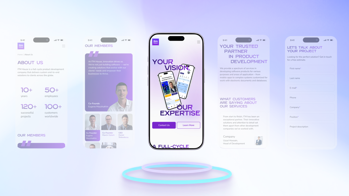 Создана визуальная система, объединяющая технологичность и человечность бренда ITM House. Строгая структурная сетка, современная типографика, акцент на реальную команду и кейсы формируют образ технологического партнёра, которому доверяют. Цветовые акценты помогают ориентироваться в структуре сайта и усиливают ощущение цифровой среды.