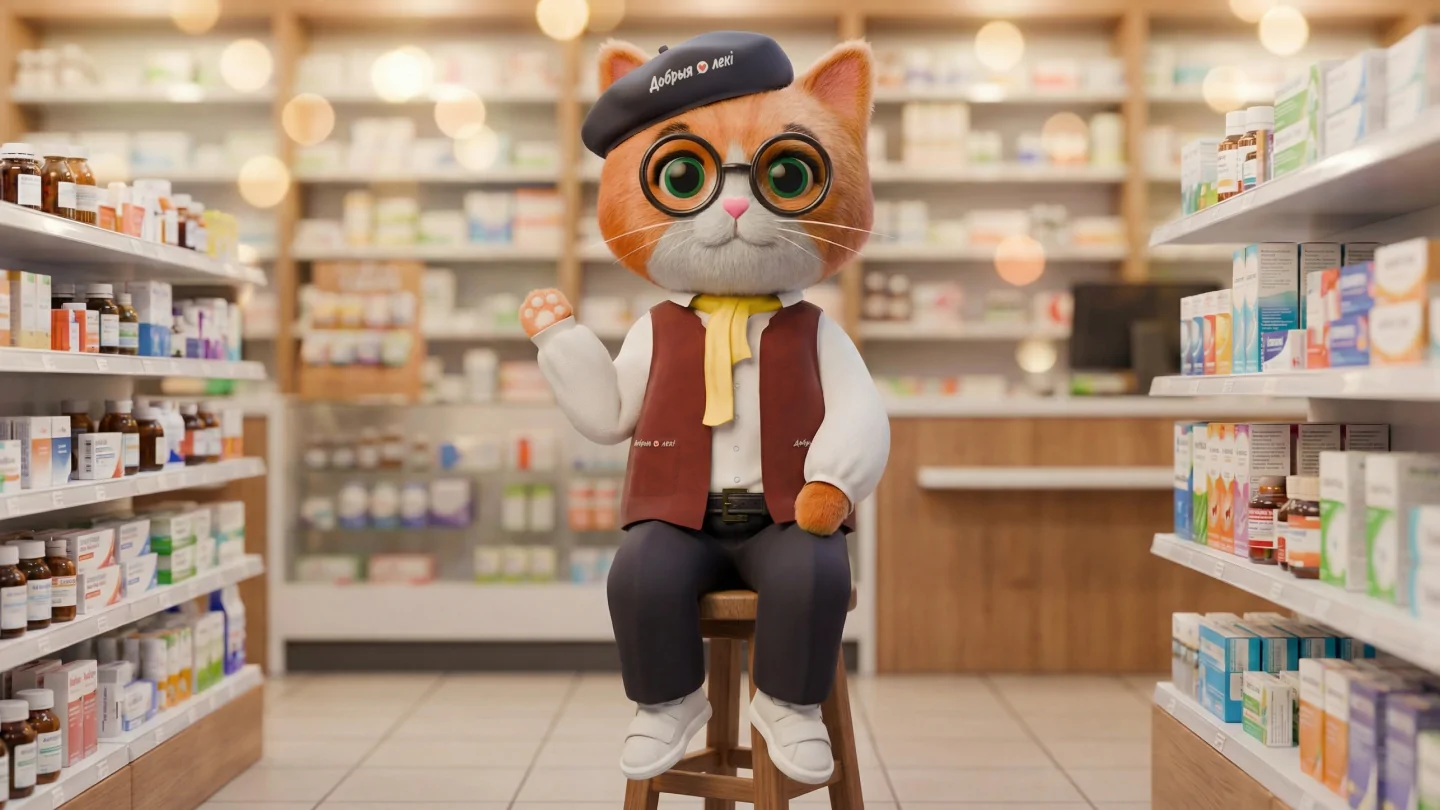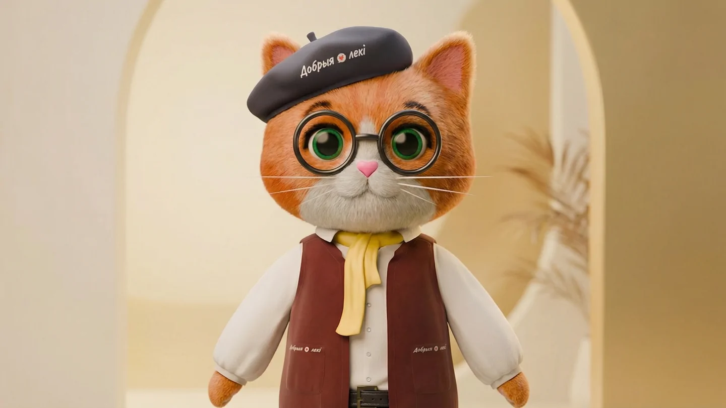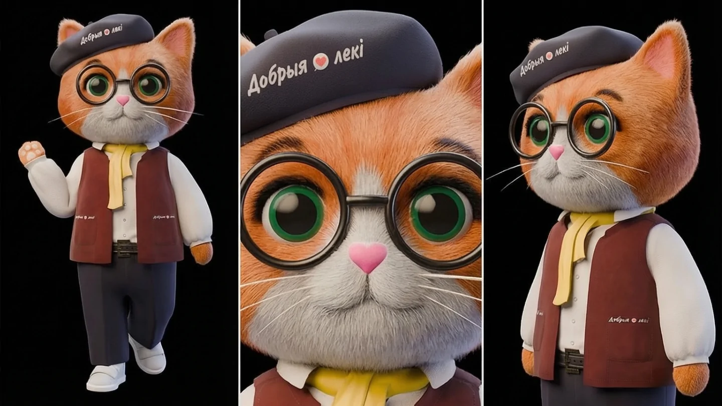 Для сети аптек «Добрыя лекi» таким персонажем стал кот Дабруля — добрый и внимательный герой, который сопровождает коммуникацию бренда. Изначально персонаж существовал в виде иллюстрации. Чтобы расширить возможности его использования в маркетинговых и рекламных материалах, было принято решение создать полноценную 3D-модель персонажа.