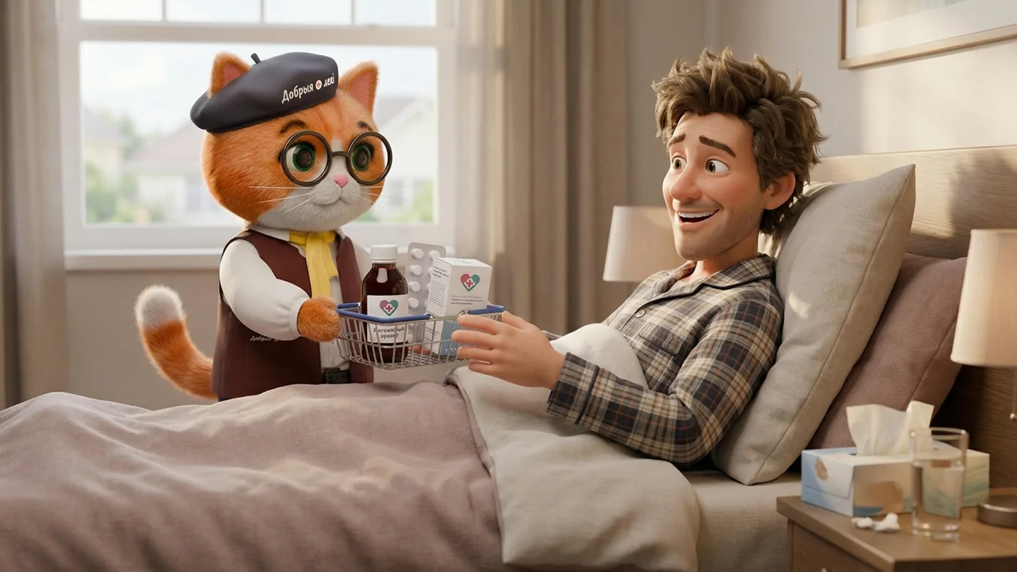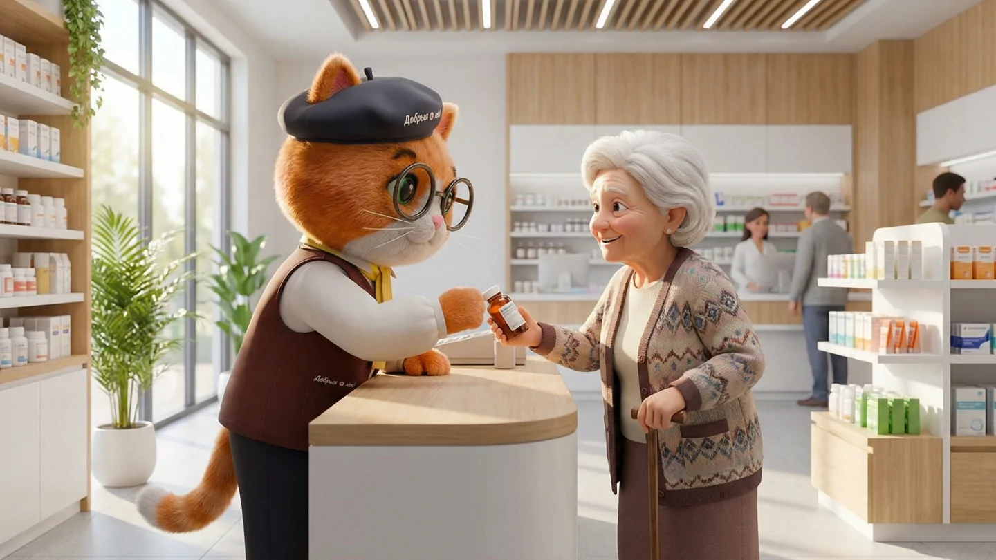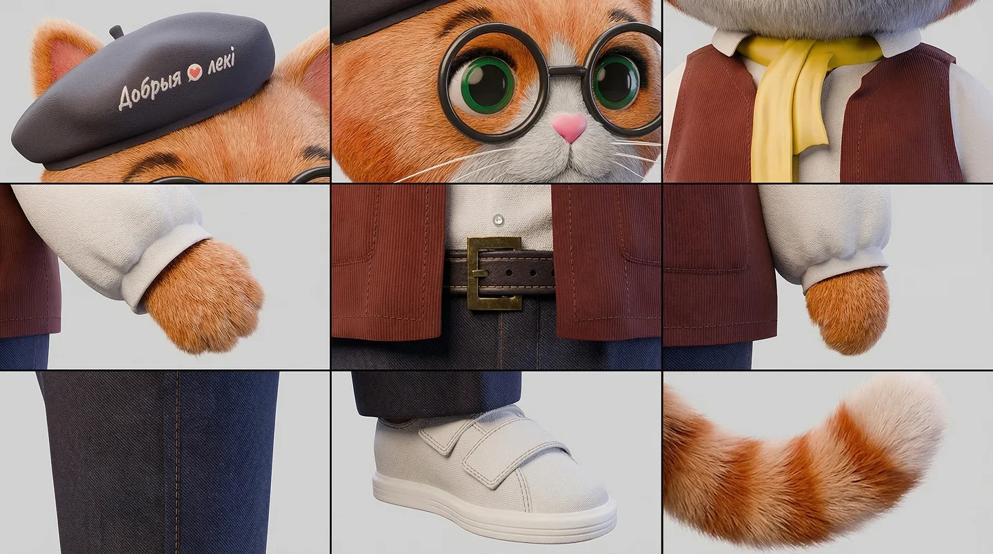 Для сети аптек «Добрыя лекi» таким персонажем стал кот Дабруля — добрый и внимательный герой, который сопровождает коммуникацию бренда. Изначально персонаж существовал в виде иллюстрации. Чтобы расширить возможности его использования в маркетинговых и рекламных материалах, было принято решение создать полноценную 3D-модель персонажа.