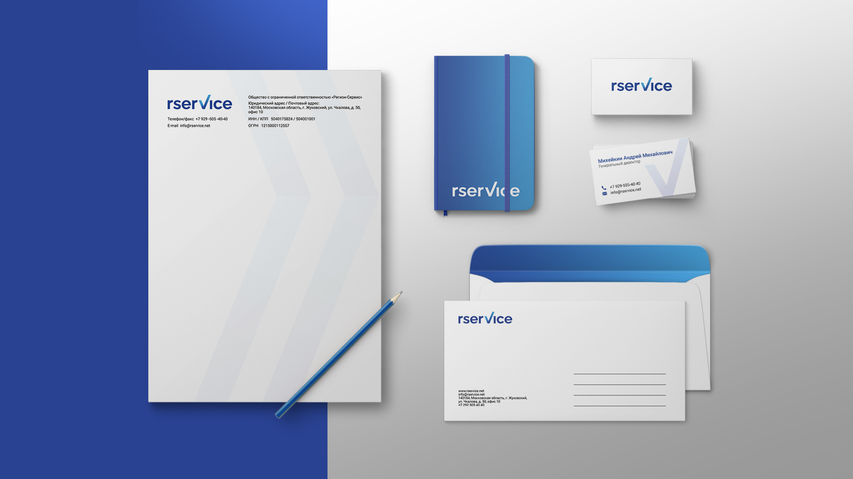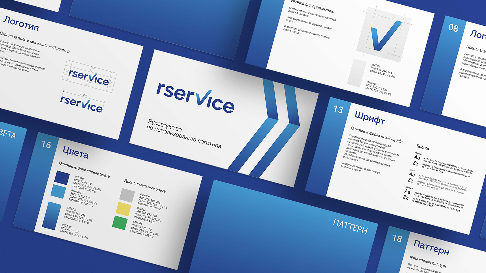 Из интересных рабочих моментов: изначально было пожелание добавить «.net» в логотип, потому что адрес сайта заказчика rservice.net. Но мы убедили не использовать его из-за возможного прочтения «сервиса нет». Также пробовали разные варианты компоновки элементов. В конечном итоге остановились на строчном написании, которое делает логотип компактным и адаптивным, и где переосмысление буквы «v» наделяет его смысловой частью.
