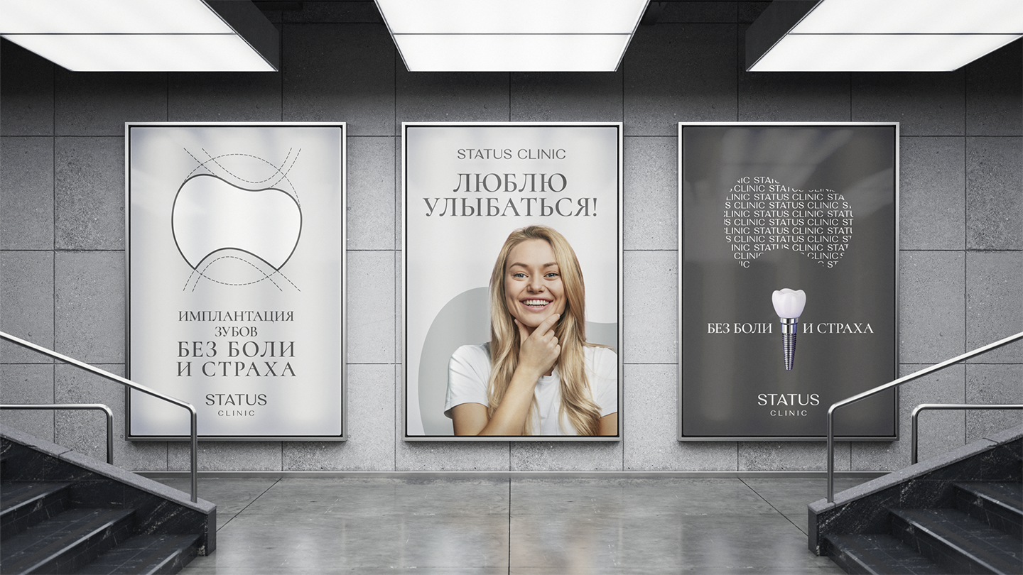 Новый бренд транслирует статус, уверенность и высокий уровень профессионализма, формируя у клиентов ощущение доверия, комфорта и персонального подхода. Логотип и фирменный стиль подчёркивают премиальное позиционирование клиники, выделяя её на фоне массовых стоматологических предложений и усиливая восприятие STATUS CLINIC как пространства современной медицины и безупречного сервиса. Созданный образ стал прочной основой для долгосрочного развития клиники и выстраивания устойчивых отношений с аудиторией, ориентированной на качество, эстетику и высокий уровень обслуживания.