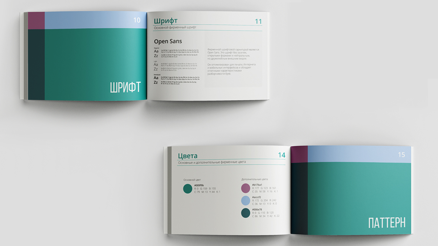 На основе логотипа была выстроена вся визуальная айдентика. Разработан фирменный паттерн, усиливающий графический язык бренда, а также цветовая система: основным стал бирюзовый цвет, дополнительно использованы голубой и пыльно-розовый.