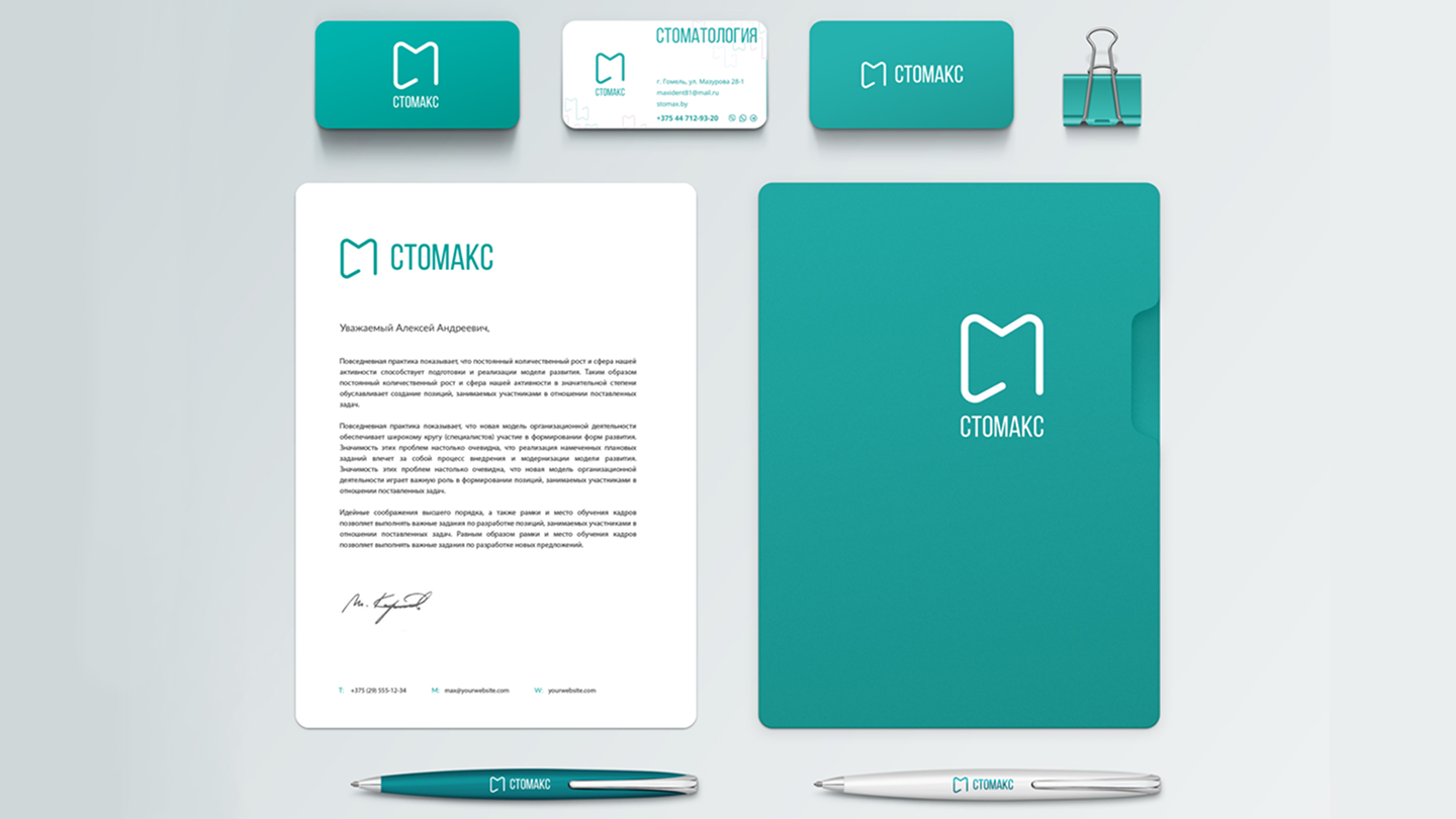 разработать логотип и фирменный стиль для стоматологии СТОМАКС, сохранив ассоциацию с медицинской сферой, но при этом уйти от шаблонных решений и создать современный, минималистичный и запоминающийся визуальный язык бренда